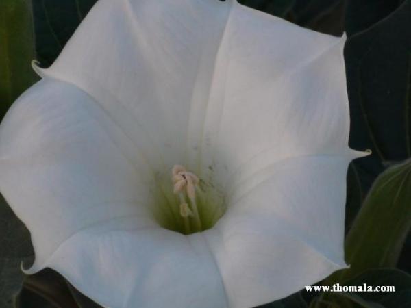 الداتورة لمحة تاريخية: لم تعرف الداتورة في العصور الوسطى إلا أنه منذ زمن قريب تم إدخالها للزراعة في مساحات واسعة في فرنسا كنبات تزييني لجمال مظهره العام. استخدم البوهيميون الداتورة بالرغم من معرفتهم لآثارها الضارة للاستفادة من أثرها التخديري دون أن تقضي عليهم باعتبار أن تناولها من التقاليد المتوارثة عن الآباء والأجداد في مواطنهم الأصلية، واستطاع العالم Stoerck عام 1762 أن يدخل نبات السترامونيا الشهير بسميته في تركيب بعض المواد الطبية لمعالجة بعض الأمراض: كداء النقطة والتشنجات والاختلاجات والاضطرابات العقلية. ونتيجة لدراسة عدد كبير من الأبحاث والمعطيات تبين أن هذه الأدوية التي احتوت على نسبة من السترامونيا في تركيبها قد نجحت في معالجة حالات الاضطرابات العقلية التي سبق وذكرت أعلاه إضافة إلى العصابات المختلفة. إلا أنه وبناء على ما تقدم لا تستعمل السترامونيا حالياً إلا كلفافات في معالجة الأمراض الربوية. التصنيف النباتي: •تعتبر الداتورة من النباتات الكورمية المانثية. •شعبة النباتات الماغنولية Magnnoliophyta أو مغلفات البذور Angiospermae . •صنف ثنائيات الفلقة Dicotyledonea. •مجموعة الرينيمات مدغمة البتلات Melophyta. •رتبة الخنازيريات Scrophulaiales. •الفصيلة الباذنجانية Solanaceae. حيث تضم هذه الفصيلة حوالي 85 جنس و 2200 نوع نباتي معظمها نباتات عشبية وبعضها جنبات صغيرة أو جنيبات أوأشجار وقد تكون متسلقة أو درنية أو ريزومات وتتواجد الداتورة برياً إلى جانب البنج أو التبغ لوجود قرابة طبيعية بينهم، فهم ينتمون لنفس الفصيلة الباذنجية ويحتوون على قلويدات سامة وتستخدم في صناعة بعض الأدوية والاسم النباتي لهذا النبات أتى من شجرة Tatora تعني الحذر Tat (وخز) واسمها اللاتيني مجال للجدل منذ القرون الوسطى. الموطن الأصلي: يعتقد أن الداتورة ذات منشأ شرقي ولها 25 نوع تنتشر في جميع أنحاء العالم وخاصة في الأقاليم المدارية وشبه المدارية وتنمو طبيعياً في فرنسا ، كورسيكا، وشمال أفريقيا وسواحل حوض البحر الأبيض المتوسط، وأشهر البلدان إنتاجاً لعشبها الأخضر هي: مصر، البرازيل، هنغاريا، روسيا، والولايات المتحدة الأمريكية. البيئة ومناطق الانتشار: تنمو الداتورة منذ زمن طويل في المكسيك ثم دخلت إلى أوروبا عن طريق إسبانيا في عام 1577 ثم انتشرت في كل مكان في الحدائق النباتية في إيطاليا والنمسا وأشير إلى أن هذا النبات وجد في فرنسا لأول مرة عام 1601منتشراً في الطبيعة ، ينمو تلقائياً على الأنقاض وفي الحقول والكروم والأراضي البور وعلى رمال الأودية المفضلة لنمو هذا النبات. الوصف النباتي لـDatura.L: •النبات حولي أو معمر •الجذر قوي النمو وتدي الشكل •الساق دائري المقطع متفرع، يتراوح طوله من 30-100 سم •الأوراق متعاقبة كبيرة وطويلة، بسيطة، عريضة، خضراء ، عاتمة، متعرجة أو مسننة بأسنان حادة وعروقها واضحة. •الأزهار منتظمة ، شعاعية ، خنثى كبيرة الحجم، بيضاء أو وردية بنفسجية ، ذو ساق معلاقية قصيرة إما مفردة أو ثنائية في القسم العلوي من النبات. •تتكون الزهرة من : -الكأس: يتألف من خمس سبلات ملحتحمة ، تشكل خمس زوايا تنتهي بخمسة أسنان مستدقة النهاية، تمتد إلى مابعد قاعدة المآبر بقليل، مشكلة بمجموعها أنبوباً طويلاً دائم الوجوه، أخضر أو بنفسجي اللون، ويصبح بعد الإزهار دائرياً، تتثبت الثمرة بمركزه فيما بعد. -التويج : قمعي الشكل يضم خمس بتلات ملتحمة بيضاء أو وردية أو بنفسجية اللون. -المذكر: يتألف من خمس أسدية حرة تنتهي بمآبر ضيقة ومستطيلة، مخططة بخطوط متوازية ، تتثبت وتلتحم مع الأنبوب التويجي من الداخل وتتعاقب مع أسنانه. -المدقة: المبيض علوي يتألف من حجرتين أو أربعة بينهما حواجز كاذبة والبويضة معلقة بالحاجز داخل الأخبية. -القلم: خيطي الشكل -الميسم ثنائي الشفة. •المخطط الزهري: Ca3CO5A5G2 -الثمرة: يتحول المبيض بعد الإلقاح إلى ثمرة علبية، كبيرة الحجم، مستطيلة إلى كروية، مشوكة، تتفتح بعد النضج إلى أربعة مصاريع لتعطي عدد كبير من البذور، سوداء اللون، مسطحة كلوي
