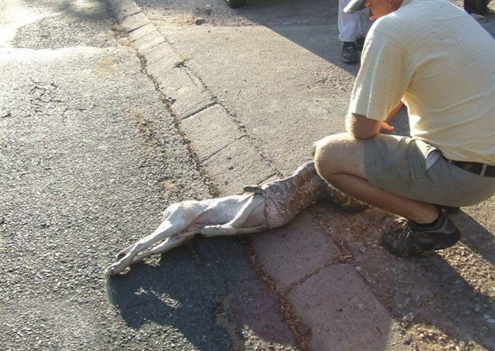 أصيبت امرأة بصدمة شديدة بعدما تبين لها أن أفعى ضخمة ابتلعت كلبتها الصغيرة. وكانت الاسترالية باتي بونتاين قد ساورها قلق شديد عندما لم تحضر كلبتها الصغيرة " بندي" إلى المطبخ كي تلتهم طعامها الصباحي، مضيفة أنه عند بحثها عنها حول المنزل رأت أفعى ضخمة من نوع "بايثون" منتفخة البطن فأدركت على الفور أنها التهمت كلبتها.
