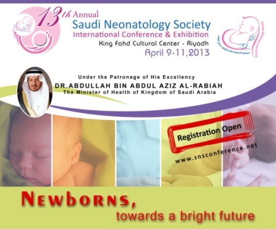 تحت رعاية معالي وزير الصحة الدكتور عبدالله بن عبدالعزيز الربيعة تفوم الجمعية السعودية لطب الأطفال حديثي الولادة بعقد مؤتمرها العالمي الثالث عشر خلال الفترة من 9 إلى 11 أبريل 2013م، في مركز الملك فهد الثقافي بمدينة الرياض.