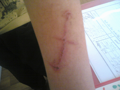 طفل فالصف السادس ابتدائي لا يتجاوز الحادية عشرمن عمره قام بحفرعلى ذراعه بسكين المطبخ صليباً.
