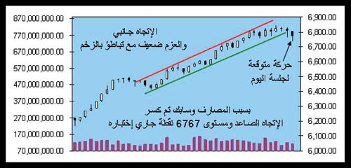 ما حدث في هذه الجلسة هو أن طابور أوامر البيع ازداد، ولكن بشكل يلبي الطلبات القائمة، ولم يصل إلى مرحلة متقدمة وهي أوامر البيع بأمر السوق في الأسهم القيادية التي صعدت بشكل كبير مثل سابك والراجحي؛ والسبب يعود إلى إعطاء جو مستقر حتى يتم الانتهاء من مناورات كبار المضاربين في أسهم المضاربة خصوصا (التأمين). وبالنسبة إلى سابك، وبإغلاقها عند 100.5 ريال وزيارتها مستوى 99.5 ريال، أعطت نمطا سلوكيا بيعيا يشير إلى أن عملية التصريف لم تنتهِ بعد، لكن الاتجاه فيها بقي صاعدا. أما القطاع المصرفي، الذي يقف عند مستوى 17.752 نقطة، فدخل في مسار جانبي فرعي، لكن معظم البيوع فيه أتت من سهم الراجحي الذي تحول إلى المسار الجانبي بعد إغلاقه دون 84.75 ريال، وبنسبة هبوط 1.75 %، أُصيب إثرها المؤشر العام بكسر في اتجاهه الصاعد على مستوى الحركة اليومية. أما على المستوى الشهري والأسبوعي فالوضع يختلف؛ يؤكد ذلك أن أحجام التداول ارتفعت في كل من سابك والراجحي خصوصا دون ترجمة سعرية صاعدة. وبإغلاق السوق عند 6.805 نقاط أصبح الحديث من الآن عن اتجاه جانبي والعزم ضعيف (121 مليون سهم)، أما الزخم فلا يزال متباطئاً .