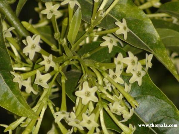 شجيرة دائمة الخضرة , غير قابلة للرعي بسبب سمية أوراقها ونواميها , يصل إرتفاعها إلى 3م , وذات تفرع كثيف من القاعدة , لها أوراق بسيطة متبادلة رمحية الشكل ، ولها أزهار دقيقة نسبيا (صغيره) , بيضاء اللون تتفتح ليلا وتنغلق نهارا , ذات رائحة زكيه تنبعث منها من العشاء الى الفجر .