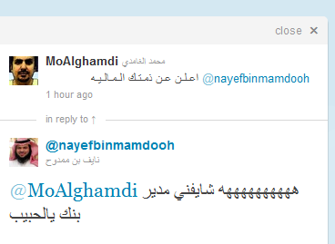 وقالــ الإمير نايف في تغريدته الإفتتاحية "بسم الله وعلى بركة الله أفتتح تويتري الخاص أنا أخوكم الفقيرإلى الله نايف بن ممدوح بن عبدالعزيزآل سعود راجيا أن يكون خير وبركة"